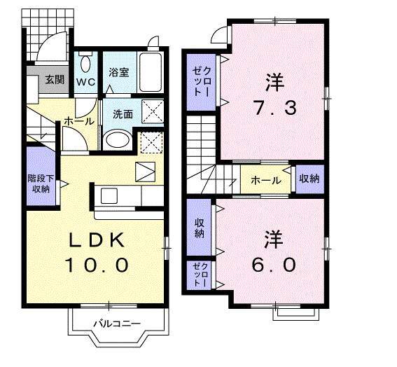 メゾネットタイプのお部屋。洋室2部屋でいいですね。群馬八幡駅から徒歩10分。人気設備多数そろっています。