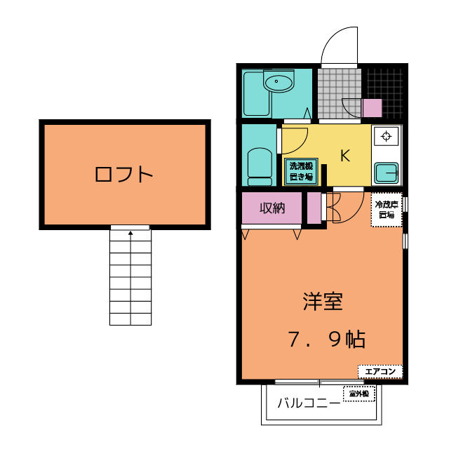 | 部屋設備 | 家具家電設置可 / ガス給湯 / 浴室給湯あり / キッチン給湯あり / 洗面所給湯あり / TV付モニターホン / 下駄箱 / ガスコンロ / エアコン / ロフト / ベランダ / 洋式トイレ / シャワー / バストイレ別 / 保証人不要 / 角部屋 / ミニキッチン |