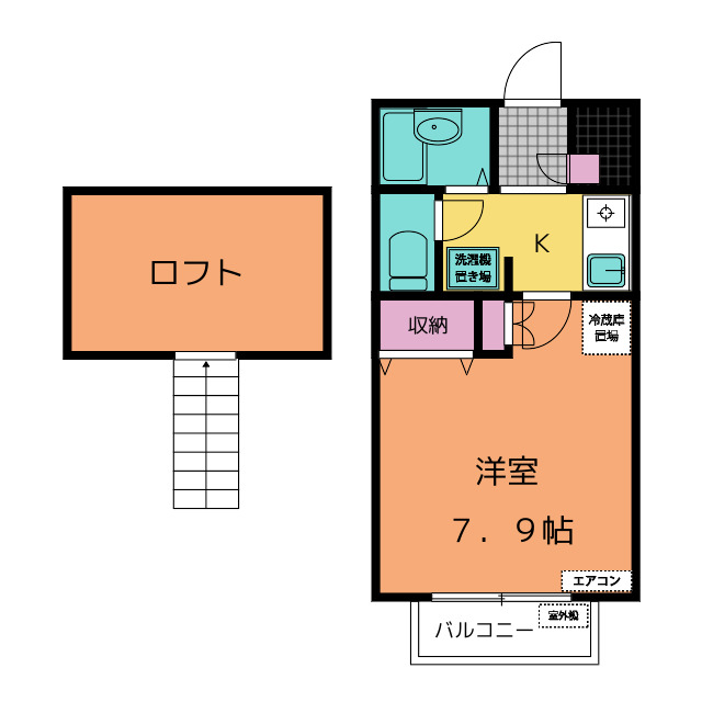 | 部屋設備 | 家具家電設置可 / ガス給湯 / 浴室給湯あり / キッチン給湯あり / TV付モニターホン / 下駄箱 / ガスコンロ / エアコン / 電話機設置可 / ロフト / ベランダ / 洋式トイレ / シャワー / 室内洗濯機置場 / バストイレ別 / 保証人不要 / 上位階なし / ミニキッチン / オンライン接客 / IT重説 |
