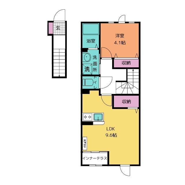 単身の方に人気の間取りで、充実した設備が付いています。インナーテラスで干すので、雨天時や花粉が気になる方にはお勧めてです。 1階部分は1Kのお部屋になっています。間取りは反転タイプです。
