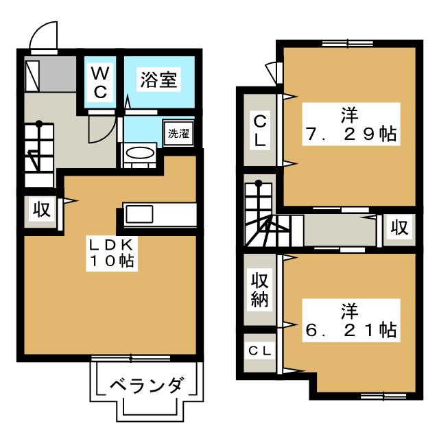 ご家族におすすめのメゾネットタイプ2LDK。駐車場縦列2台で55000円(税込)です。物置や専用ごみ捨て場付き。