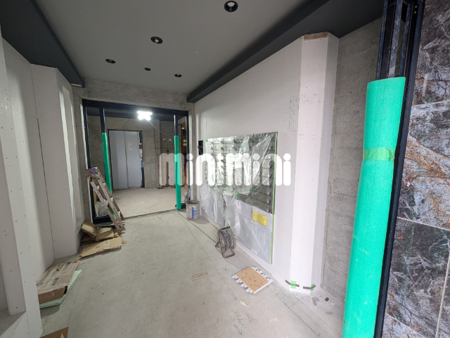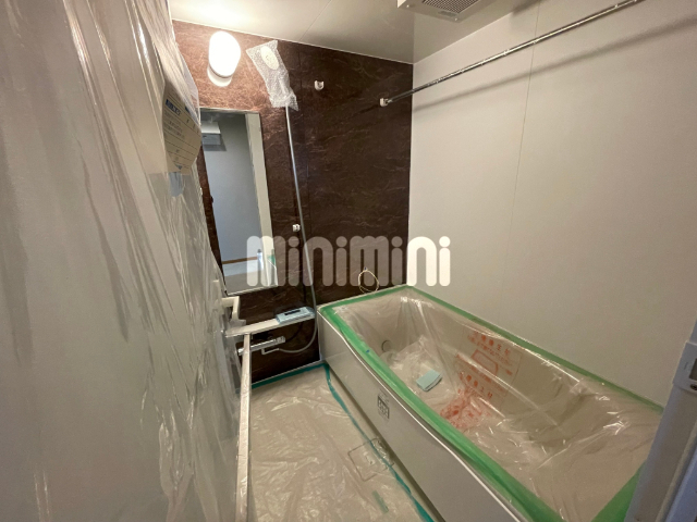 鏡面保護シールが初々しい新築の建物、更にシステムキッチン設置済で一体感のあるデザインの台所です。充実した設備と広いバスルームで癒しをご実感いただけます。また手つかずの新築で、その上留守番いらずの宅配BOX付なので、ネット通販大好き派にはお勧めです。