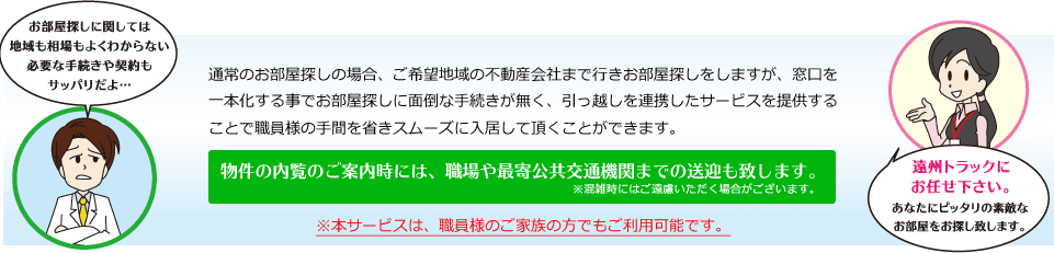 | 下の「お部屋探し依頼フォーム」からご希望のお部屋の情報を記入し、お送りください。担当者へ直接お問い合わせが届きます。「提携不動産会社のお部屋を見る」では、どんなお部屋があるか見る事ができます。 | 「こんな条件のお部屋はないの?」「直接話をして部屋を探したい」などサイト以上のご要望も受け付けておりますので「お部屋探し依頼フォーム」送信時にあわせてご記入ください。 | ご連絡後、提携不動産会社の担当者より物件資料をお送り致します。資料をご覧いただき、その他にご要望があればお伝えください。 | 気になる物件が見つかりましたら、担当の仲介店舗へご来店いただき、下見・契約を行います。担当店へは手配済ですのでスムーズにご紹介致します。 |