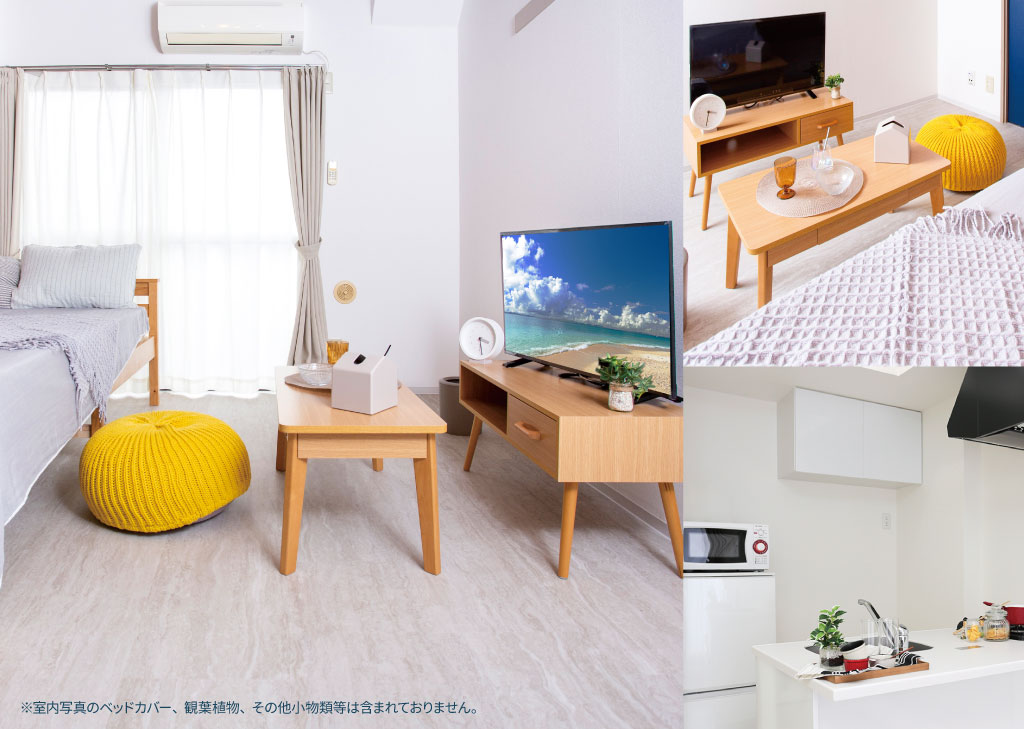 基本的に事前に搬入・設置を行っておりますので、寝具や生活雑貨等をご自身でご用意いただければ、入居日からご使用可能です。