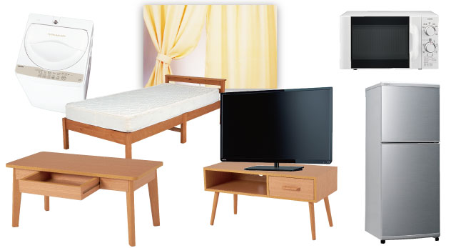 お部屋により、異なります。新品の家具家電のセットを家賃+6,000円(学生契約の場合)で付けられるプランや、利用料金のかからない設置済みお部屋など、お部屋によって条件が異なります。詳しくは資料請求時にご相談ください